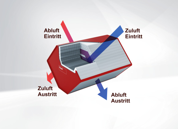 Luftführung durch Gegenstrom-Plattenwärmetauscher.